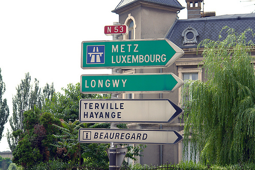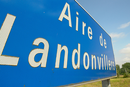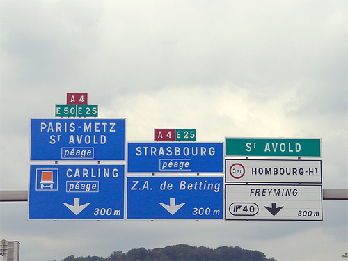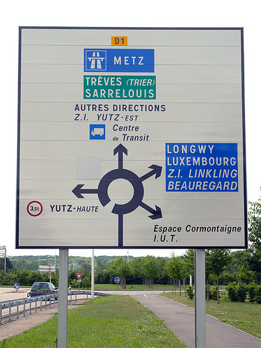 L2 is set in white on blue (Autoroutes) or green (Routes Nationales) background and is used for distant targets. L1 and L2 are basically the same design, but L2 is lighter and set with increased spacing to compensate for the overglow effect of white letters.
