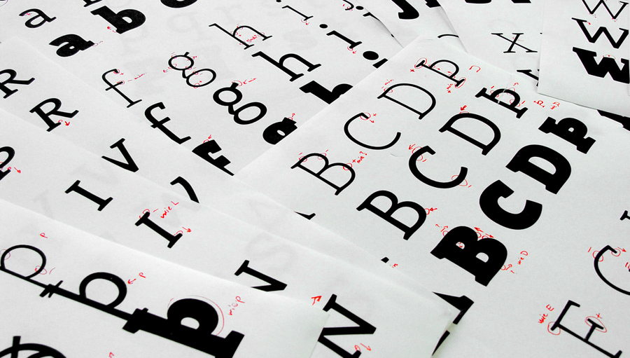 When the basic alphabet is drawn I also do a lot of testing in design application. Even when the font is targeted to print use, working with the font on screen in a design application is where the user “feels” the font for the first time—in terms of proper spacing, the behavior of OpenType features and so on. Many problems with a font appear at this stage and can be corrected instantly in the font editor.