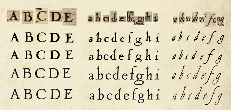 The look of the typeface is of course heavily influenced by the copper engraving tools, which don’t permit the flowing movements of writing with a quill. Instead each stroke is carved individually, usually without the possibility to change the direction while carving. This gives the typeface it’s chiseled and sturdy appearance.