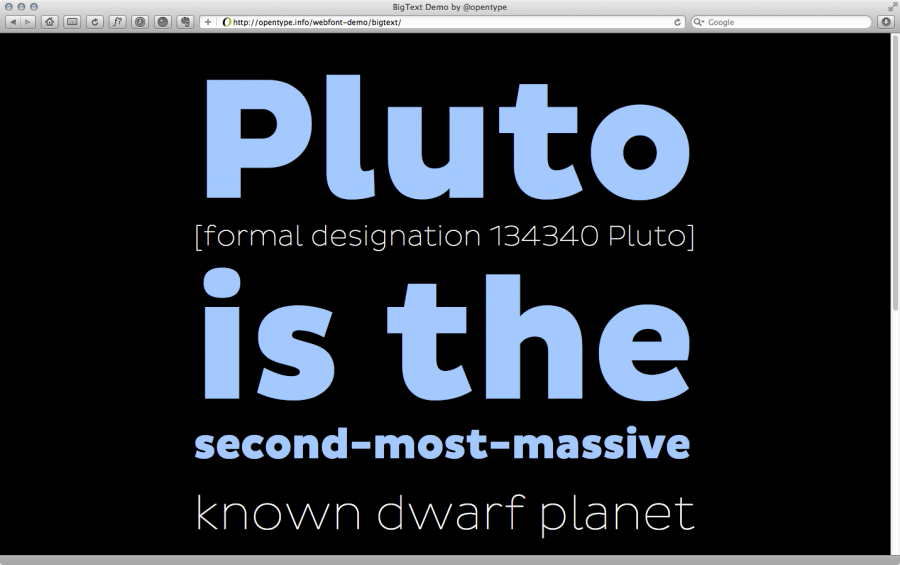 Here is a demo I created using the new Pluto Sans typeface by HVDfonts. None of these lines have any font-size settings. It’s all handled automatically by BigText.