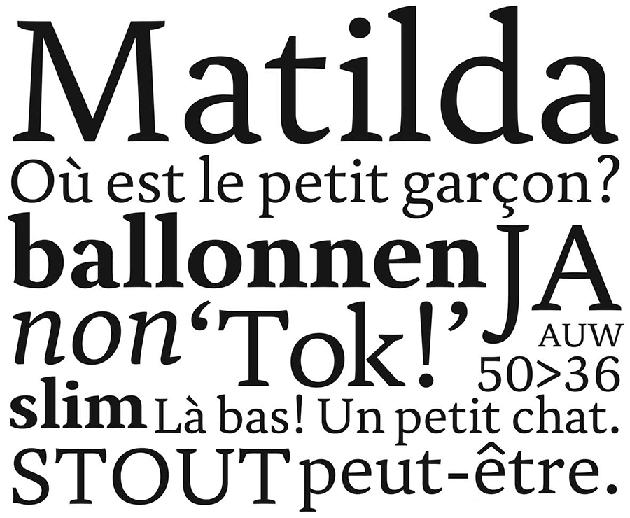 Matilda is in full development and a growing type family (also ready to test within new legibility research). The typeface includes a serif, an italic, a bold, a sans serif. Matilda is also extended by the design parameters that were most helpful to improve the decoding process of children with low vision. These are mainly the parameters rhythm and direction. More research will be done because it would be interesting to know in which a lesser degree is still helpful. Also the outcome of interaction effects would give more insight in legible fonts for children with low vision (and human perception). The main characteristics of Matilda are wide, open and round letters which have a friendly feeling. The letters are dynamic and solid, constructed and organic. The letters are built on a rather stable and vertical axis. The curves are open, the serifs are asymmetric, convex and concave. There are ball terminals to emphasize the letter terminations to augment its individuality and distinctiveness. The low contrast in the letters is necessary to easily enlarge or reduce text. If children with low vision are reading in different contrasts/colours (they often do by computers) the letters need to remain very clear. Matilda doesn’t have a very large x-height. The ascenders and descenders provide enough room for diacritics.