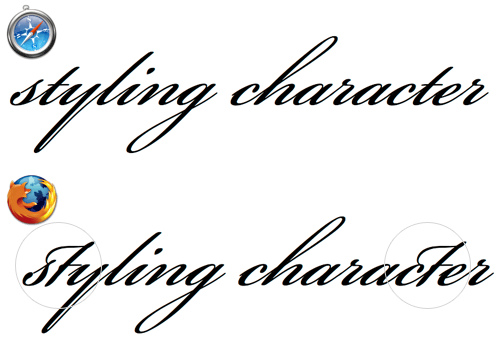 Firefox doesn’t seem to check for context-dependent replacements. Which is a great pity, because this is the real power of OpenType layout features. See this next example: